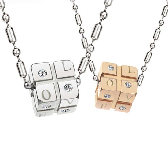 Understated yet distinctively dashing. This extraordinary pair of cube pendant necklaces features a masterfully crafted design. Product Content: 1x Titanium Steel Love Cube Pendant Pair Couple Necklaces. Condition:New Location:Hong Kong Material:Titanium Steel Brand:CET Domain MPN:SZ17-N044 Dimensions:Pendant: Male: WIDTH: 13m| LENGTH: 13mm, Female: WIDTH: 12mm| LENGTH: 12mm Necklace: LENGTH: 55cm Warranty 30 Days BRAND : CET Domain
