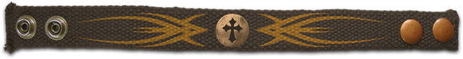 Kerusso's canvas web bracelets are enhanced with printing, applique, embroidery, and studs. Molded after the military webbing used for Army uniforms, bracelets are stylistically distressed.