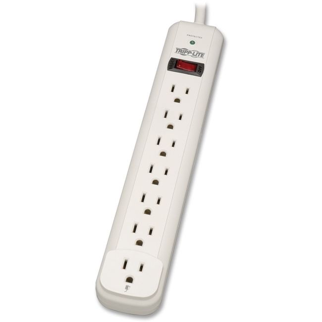 Surge suppressor offers economical AC surge suppression for protection of workstations, desktop PCs, telecom systems and other sensitive electronics. AC surge suppression shields connected equipment from damage and performance problems due to transient surges. The TLP725 offers 7 total outlets, 25' cord and diagnostic LEDs to confirm outlet grounding and surge suppression status. Built-in power switch with integrated 15 amp circuit breaker offers power control and overload protection over all outlets. AC suppression rated at 1080 joules shields equipment from surges and line noise. Fail-safe thermal fusing protects against fire and other damage in the event of an extreme, extended overvoltage or surge condition. White housing with keyhole mounting slots and one designated transformer plug outlet offer convenient protection of desktop computer equipment and accessories.