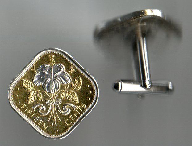 Each one of these real 15 cent ( U.S. quarter size) new, un-circulated coins from the Bahamas is first layered in pure 24k gold. Then the figures of each are highlighted and brought to life with bright pure silver (this silver work is done by hand). This breathtaking and exclusive work turns these coin into stunning and true works of art. Each coin is hermetically sealed against wear in clear, hard acrylic coating. These coins are then made into unique pairs of cufflinks and placed in a nice jewelry box. Warranty 90 days BRAND : J&J Coin Jewelry