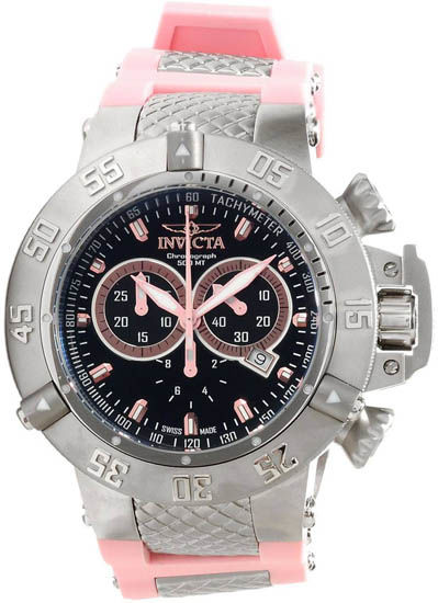 Short Description: Subaqua Diver Chronograph Stainless Steel Case Pink Rubber Bracelet Black Tone Dial Additional Details Invicta Subaqua Diver Chronograph Stainless Steel Case Pink Rubber Bracelet Black Tone Dial Unisex Following you to whatever destination you will travel the Subaqua Diver collection. Case measures 50mm diameter by 20mm thick. Black and pinkWarranty 30 Days plus Manufacturer