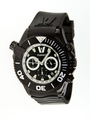 Vuarnet Watches was developed in the concern of the respect for the values conveyed by the brand Vuarnet for 50 years by integrating what makes its strength; technicality; use of innovative materials and aesthetic boldness. In 1990; Vuarnet entered the world of watch making; launching a range of watches which innovated in terms of design and style; including the famous Vuarnet Cup; with its removable measuring instruments. Item Shape: Round Display Window Material Type: Mineral Display Type: Analog Case Material: Stainless Steel Case Color: Black Dial Color: Black Band Material: Polyurethane Band Color: Black Clasp: Buckle Dial Color: Black Bezel Function: Unidirectional Bezel Color: Black Special Features:Date Display; Tachymeter; Chronograph; Tac ;m msafgioj;;; Band Color: Black Rubber; Band Width: 27mm near case; 22mm near clasp/buckle; Bezel Color: Black; Case: Black + Circle-shaped; Case Finish: Polished + Stainless Steel; Case Thickness: 13mm; Case Width: 46mm; 51mm with crown; Clasp / Buckle: Strap Buckle; Dial: Black + analog; Hand Color: Silver; Movement: Japanese + quartz; Time Zones: Single; Water Resistance: 10 atm; Other Features: Date Display; Tachymetre BRAND : VUARNET