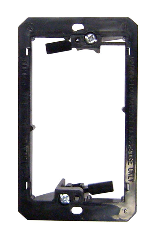 Nylon Low Voltage Wall Plate Mounting Bracket, Single Gang. This single gang mounting bracket is designed for use in homes and / or offices where you needs to correctly mount a single gang wall plate for low voltage installations such as networking, Home Theater or other similar audio / video applications. To install cut a rectangular hole in the dry wall / wall surface which is approximately the width and height of the raised rectangle on the back. A correctly sized hole will have the outer portion of the mount backed by the wall, so that it does not push through. One then backs up on the flap screws enough so that they clear the dry wall upon insertion. Once inserted you tighten the screws back down, making sure the flaps swing outward, until the mounting bracket is snugly against the wall. Now you have a mount to which to screw your wall plate to. Additional Details Color: Black. Weight: .1 lbs. Nylon Low Voltage Wall Plate Mounting Bracket, Single Gang. Home Theater or other similar audio / video applications. BRAND : CABLE WHOLESALE