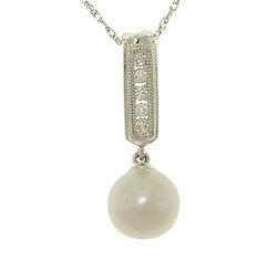 Command attention with this attractive cultured saltwater White Pearl Diamond 14K white gold dangle milgrain pendant necklace. This milgrain dangle pendant has a cultured saltwater White Pearl. There are also five Diamonds on this Pearl dangle pendant. Each Diamond is round-brilliant cut. This Pearl Diamond milgrain pendant is made of 14K white gold. You will also receive a free white gold chain with this Pearl Diamond pendant. Set your sights on this appealing cultured saltwater White Pearl Diamond 14K white gold dangle milgrain pendant necklace!' Attributes: - GENDER: Women's