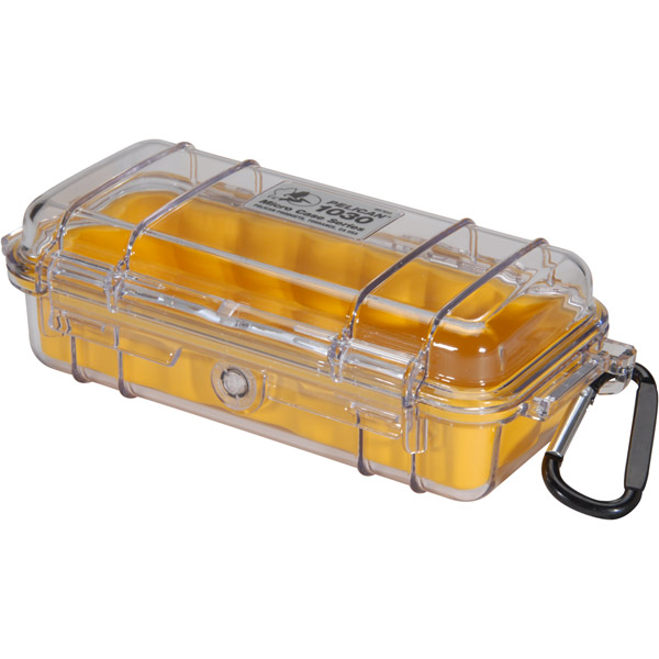 1030 MICRO CASE YELLOW W CLEARLID, LINER 6.37X2.62 CLEAR YELLOW Great for rugged sportsnot for swimming or submerging Water-resistant, crush-proof and dust-proof Rubber liner for extra protection doubles as O-Ring seal Automatic pressure equalization valveStainless steel hardware 6 3/8" W x 2 5/8" H x 2 1/16" DLifetime guarantee Includes carabineer BRAND : PELICAN