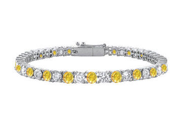 Prong set brilliant cut round yellow sapphires alternating with white CZs symbolizes never ending chain of your timeless love. Made in 14K white gold held in a prong setting this tennis bracelet has a total gem weight TGW of 7.00 carats.