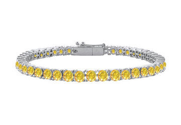 This gorgeous tennis bracelet surrounded on your wrist with round yellow sapphires in prong setting. The entire bracelet is made in 14K white gold and has a total gem weight TGW of 10.00 carats. Continuous row of gems signifies your everlasting love.